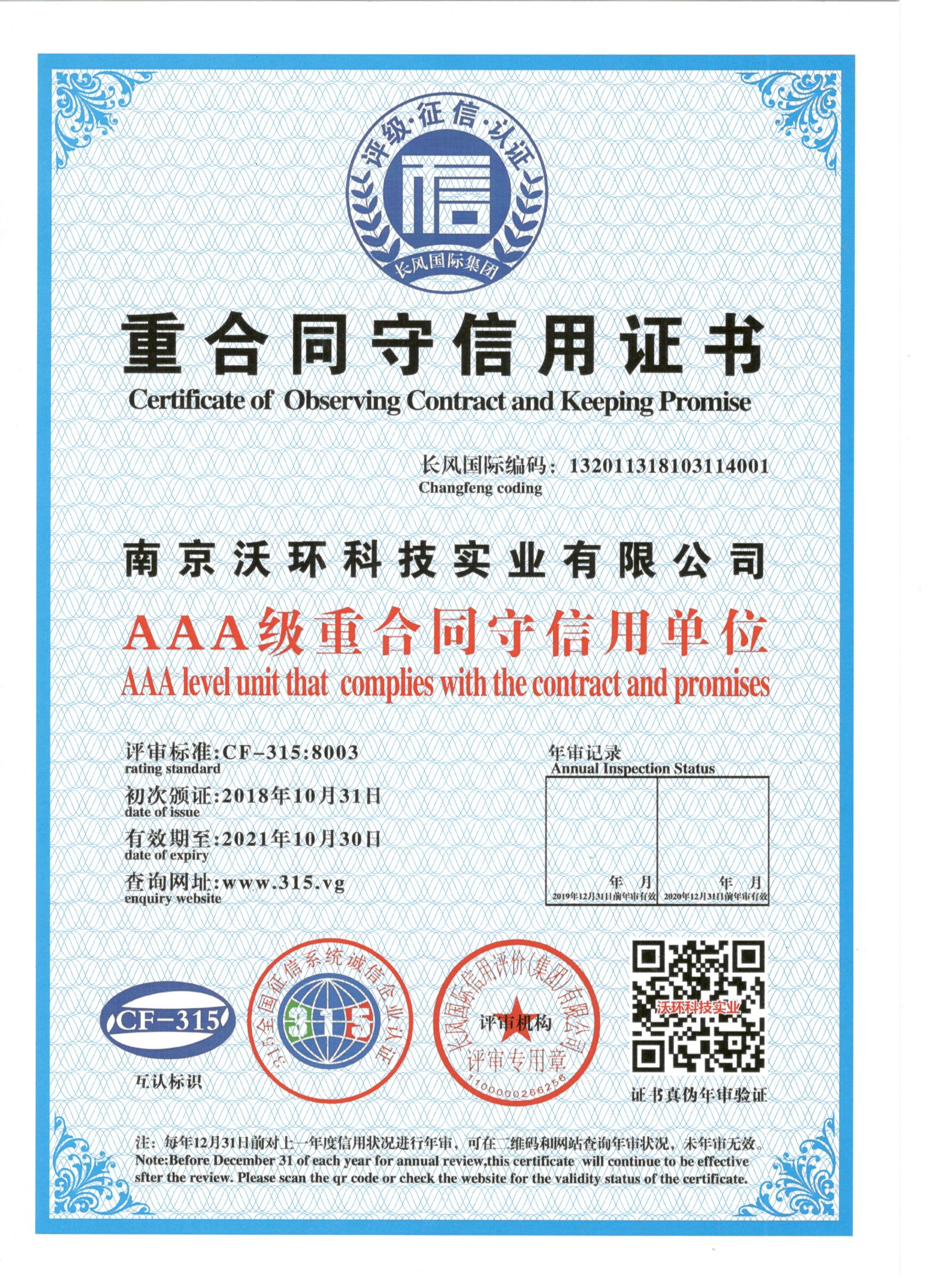熱烈祝賀南京沃環(huán)公司被專業(yè)評(píng)審機(jī)構(gòu)-長(zhǎng)風(fēng)國(guó)際集團(tuán)評(píng)為AAA級(jí)重合同守信用單位,特發(fā)此證書